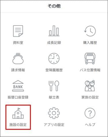 【設定】緊急時の連絡先を設定する2025年11月24日 更新 下部メニューの [その他] をタップします。 [施設の設定] をタップします。 設定したい、お子さまの園(施設)をタップします。 [連絡先リストの設定] をタップします。 [連絡先を追加] をタップします。 連絡先情報を入力し、 [追加する] をタップします。 連絡先の優先度は、名前横の数字順になります。優先度を変更したい場合は、右上の [並び替え] から変更します。 連絡先リストを確認し、[連絡先リストを更新する] > [OK] をタップします。