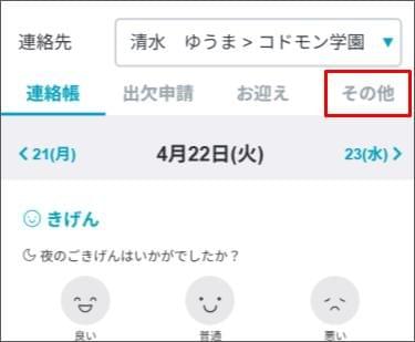 連絡事項を送信する2025年12月8日 更新園(施設)が連絡受付を設定している場合、保護者アプリで連絡事項を送信できます。 下部メニューの [連絡] をタップします。 兄弟姉妹がいる場合は、「連絡先」> [プルダウン]からお子さまと施設を選択します。 [その他] のタブをタップし、連絡をしたい日付を選択します。 0時を過ぎると、翌日の日付が自動的に表示されます。 「入力欄」に連絡内容を入力します。 [先生に連絡する] > [OK] をタップします。 連絡が確認中の場合、申請取消ができます。