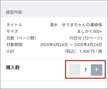 - プレビューを確認後、「注意事項、設定内容」を確認のうえ、購入数を選択します。(最大2冊まで)
