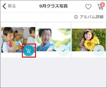 - 他のアルバムの写真も併せて購入する場合は、左上の [戻る] をタップし、アルバムを選択し直します。その後、同じように写真をカートに追加します。
