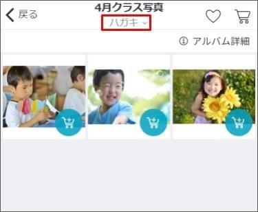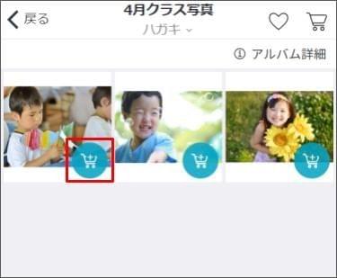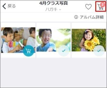 他のアルバムの写真も併せて購入する場合は、左上の [戻る] をタップし、アルバムを選択し直します。その後、同じように写真をカートに追加します。 - 購入したい写真をカートに入れ終わったら [カートマーク] をタップします。