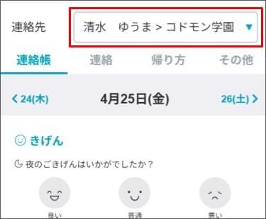 - 兄弟姉妹がいる場合は、「連絡先」> [プルダウン]からお子さまと施設を選択します。