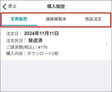 写真・連絡帳製本・用品販売の購入履歴を確認する2025年11月24日 更新 下部メニューの [その他] をタップします。 [購入履歴] をタップします。 確認したい購入履歴の [写真販売、連絡帳製本、用品注文] のタブをタップします。 確認したい購入履歴をタップし、内容を確認します。