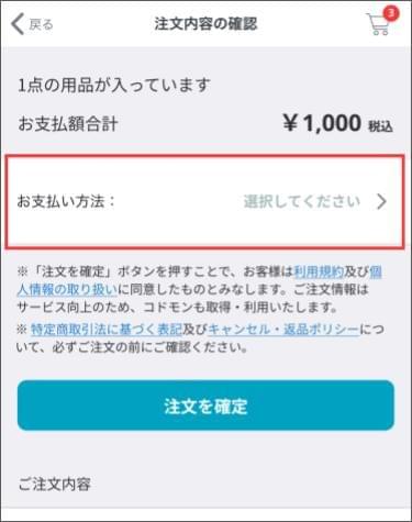 - 注意事項を確認し、[お支払い方法] または [注文確定] をタップします。