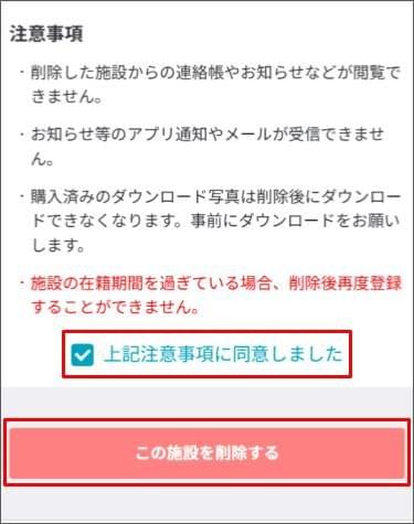 - 注意事項を確認し、[上記注意事項に同意しました] にチェックを付け、[この施設を削除する] をタップします。