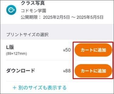 - 購入したい写真のプリントサイズの [カートに追加] をタップします。