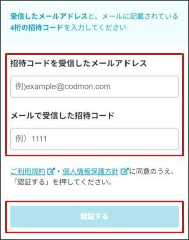 - 招待されたメールアドレスと記録した招待コードを入力し、利用規約・個人情報保護方針に同意のうえ、[認証する] をタップします。