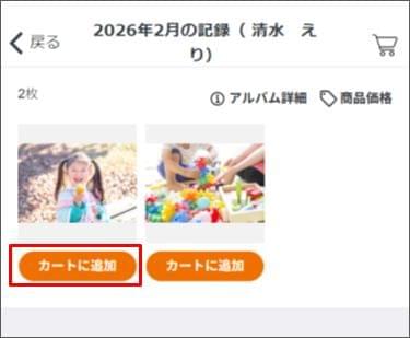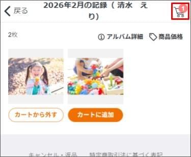 - 他のアルバムの連絡帳写真も併せて購入したい場合は、左上の [戻る] をタップし、アルバムを選択し直します。その後、同様に写真をカートに追加します。